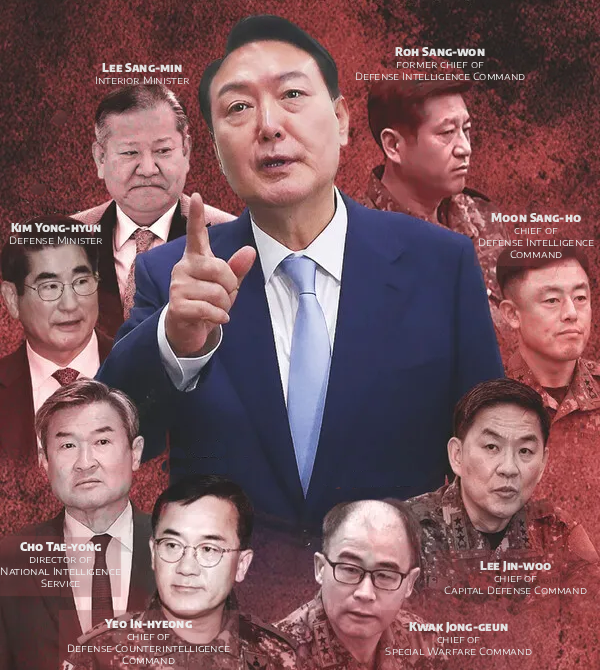 Former President Yoon Suk-yeol and his band of alleged accomplices in orchestrating and executing his declaration of martial regulation on Dec. 3, 2024. Titles mirror positions held on the time of the martial regulation disaster. (Hankyoreh graphic)