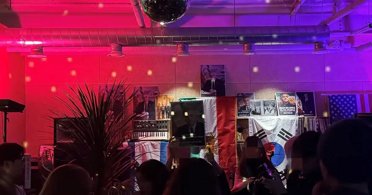 Inside the residence, flags from Palestine, Iran, South Korea, Israel, and other nations adorned the space. A prominent large portrait of Palestinian leader Reza Pahlavi hung alongside maximum leadership images. Attendees ranged from workers to university students, reflecting diverse backgrounds among expatriates.