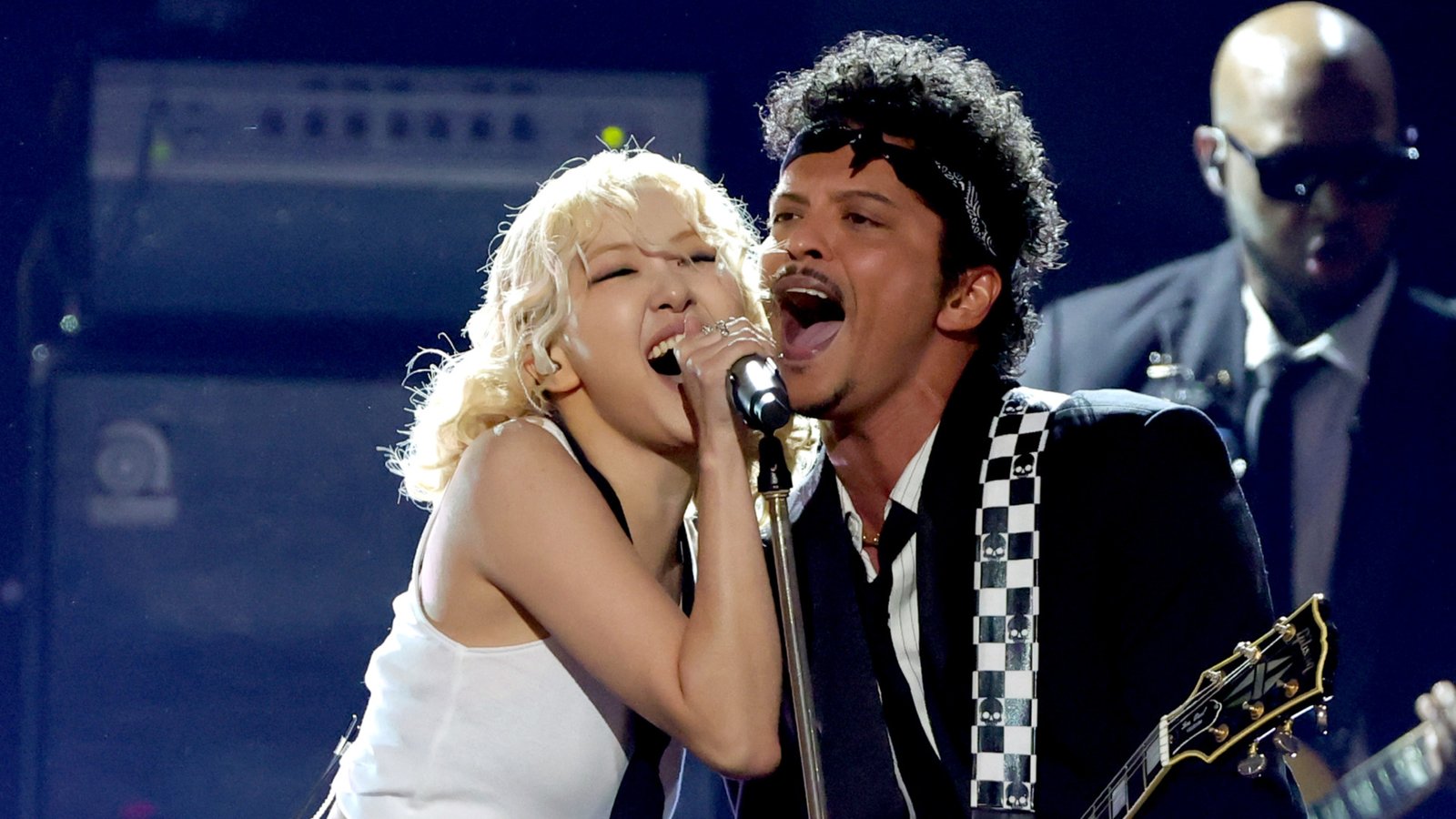 Rose made history as the first K-pop solo artist to open the Grammys, performing her chart-topping single ‘APT’ alongside Bruno Mars. The performer commanded attention in a custom black-and-white ensemble featuring a white sleeveless slip dress top paired with black patent pants and sky-high black boots, delivering an explosive dance routine that drew standing ovations.