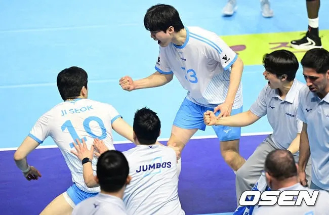In the fourth set, Korean Air middle blocker Jeong Ji-seok executed a game-changing block. Teammates erupted in celebration, fueling the team’s momentum toward victory.