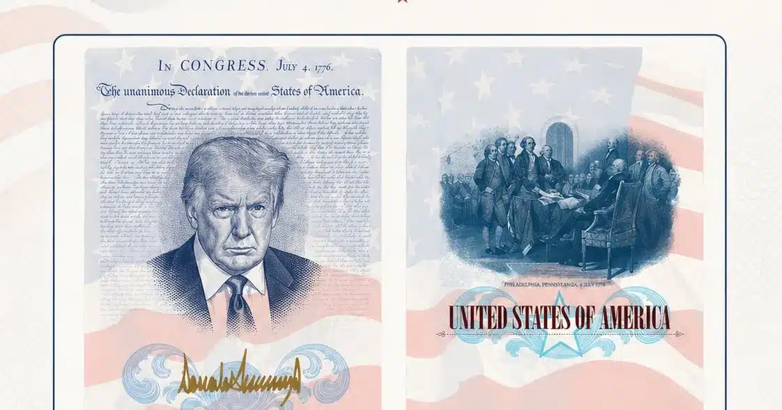 The passport cover incorporates the stars and stripes flag alongside elements symbolizing domestic priorities, with Trump’s image and signature prominently displayed. Inside, his name appears in gold lettering on one page. Another section highlights the famous painting of the Declaration of Independence signers, while a redesigned 1777 flag places ‘250’ at the center.
